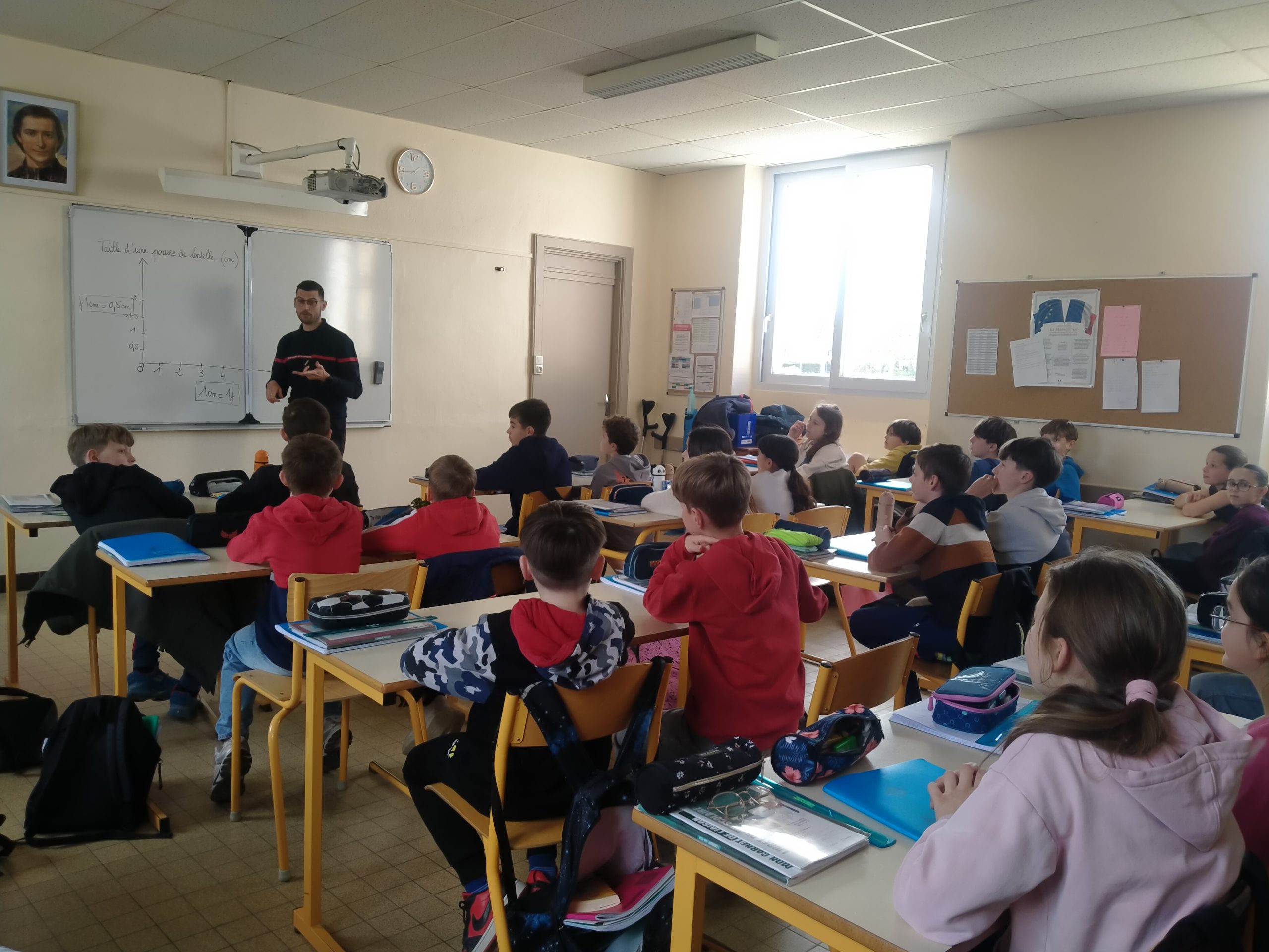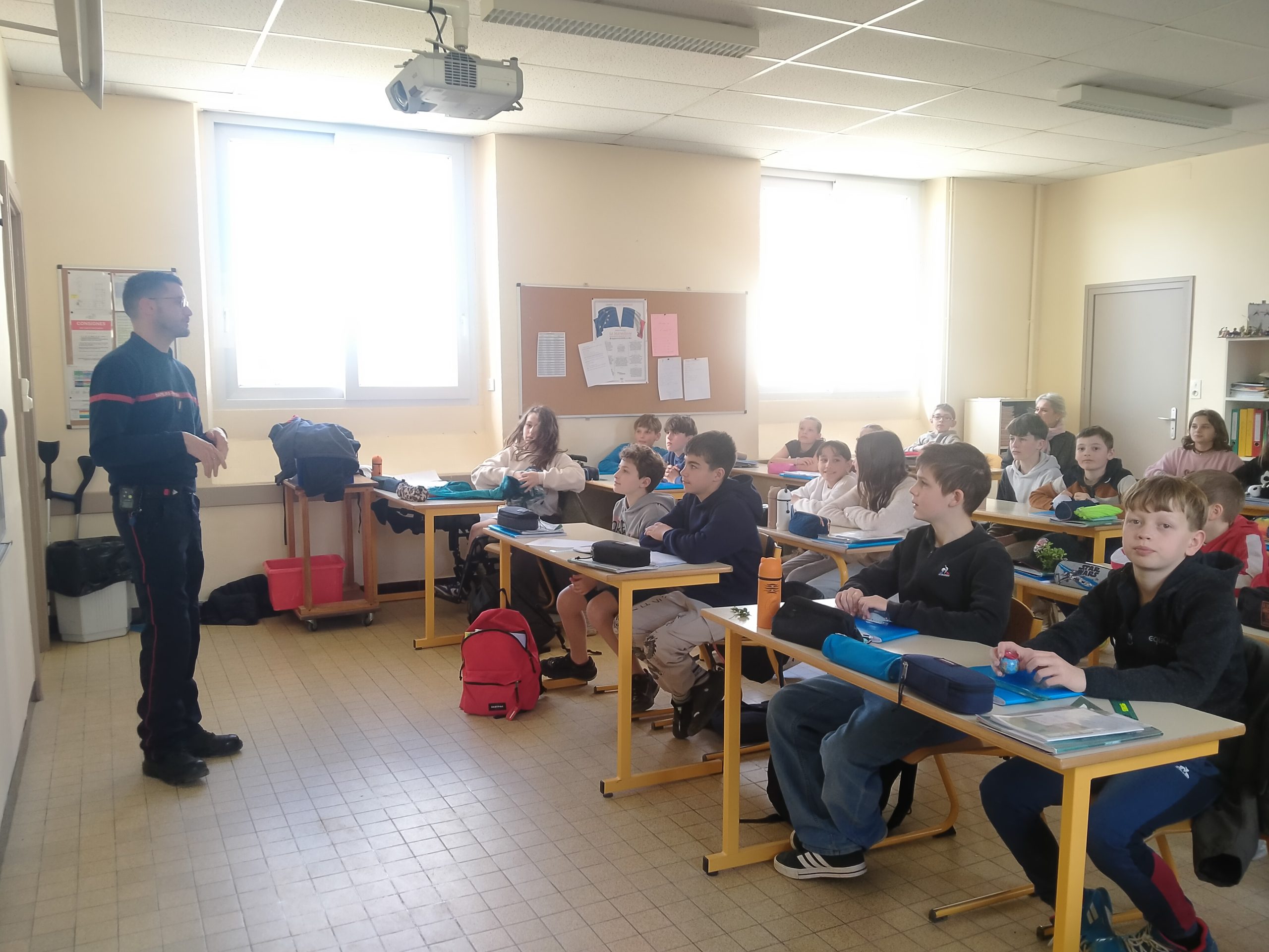 Yan GABARD, responsable de la section des Jeunes Sapeurs Pompiers du canton est venu à la rencontre des élèves de 6e vendredi 27 mars pour leur expliquer en quoi consistait cet engagement et la possibilité de postuler au recrutement 2026. Les élèves se sont montrés très à l’écoute et ont posé de nombreuses questions. Peut-être cette rencontre a-t-elle fait naître des vocations parmi nos jeunes élèves ?